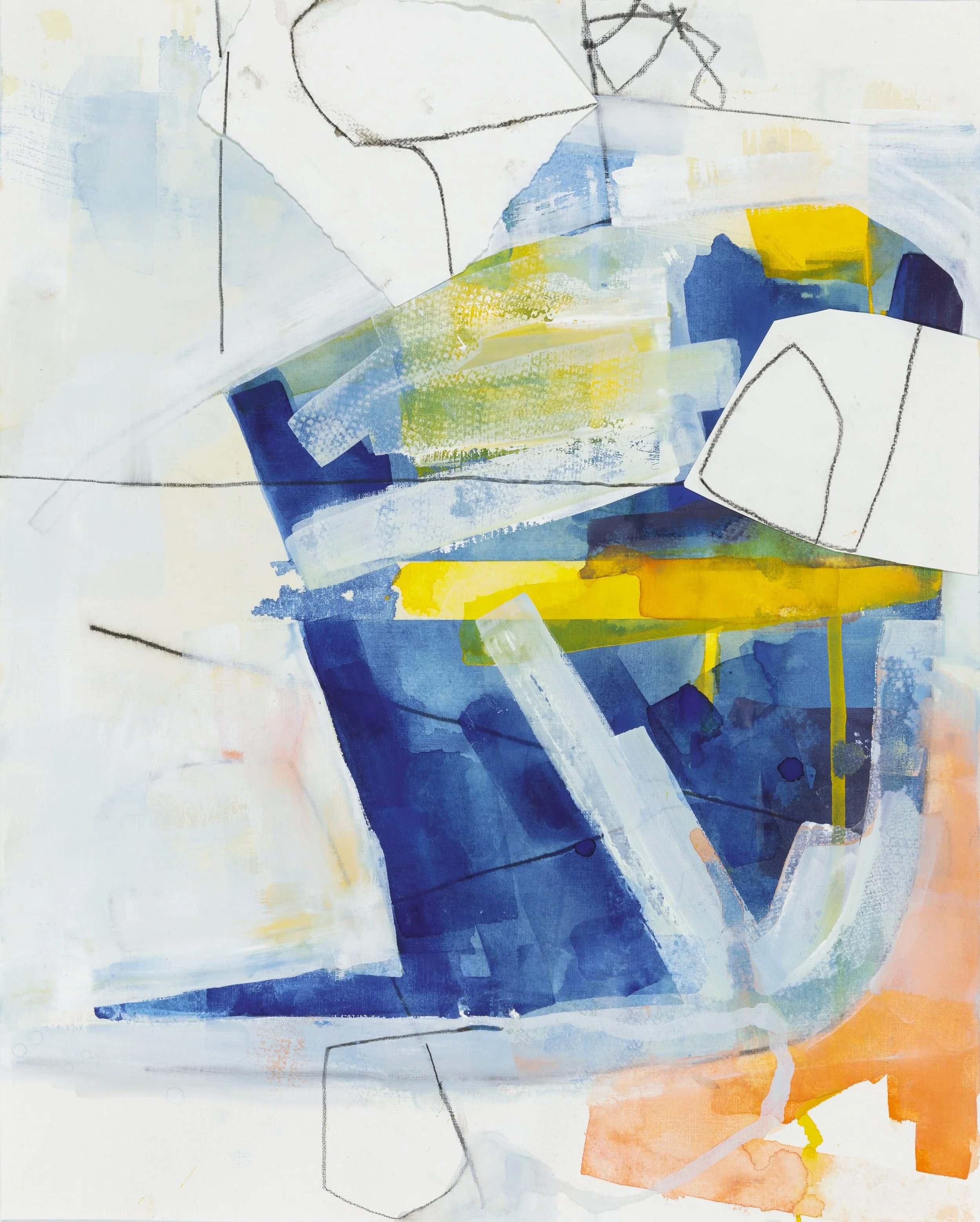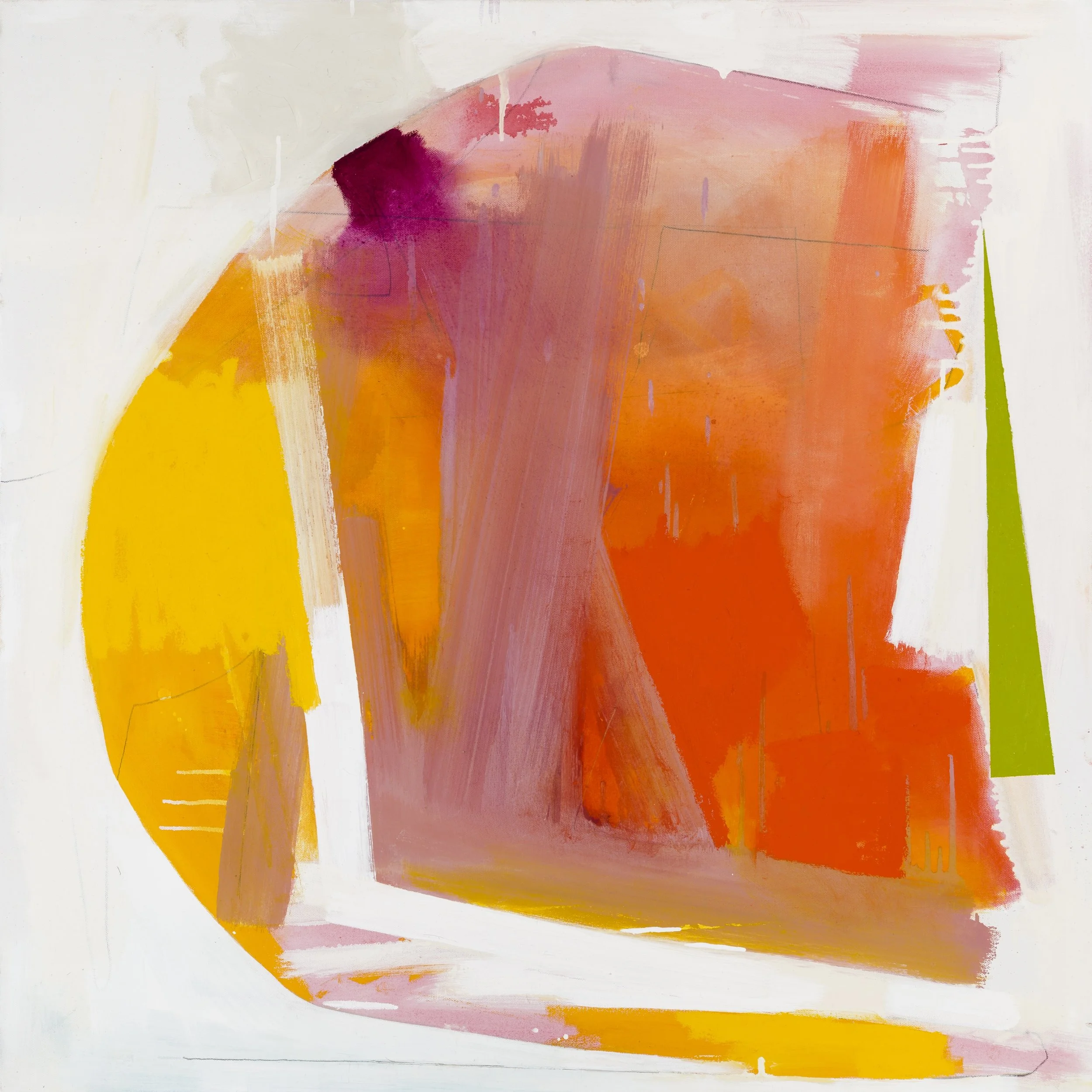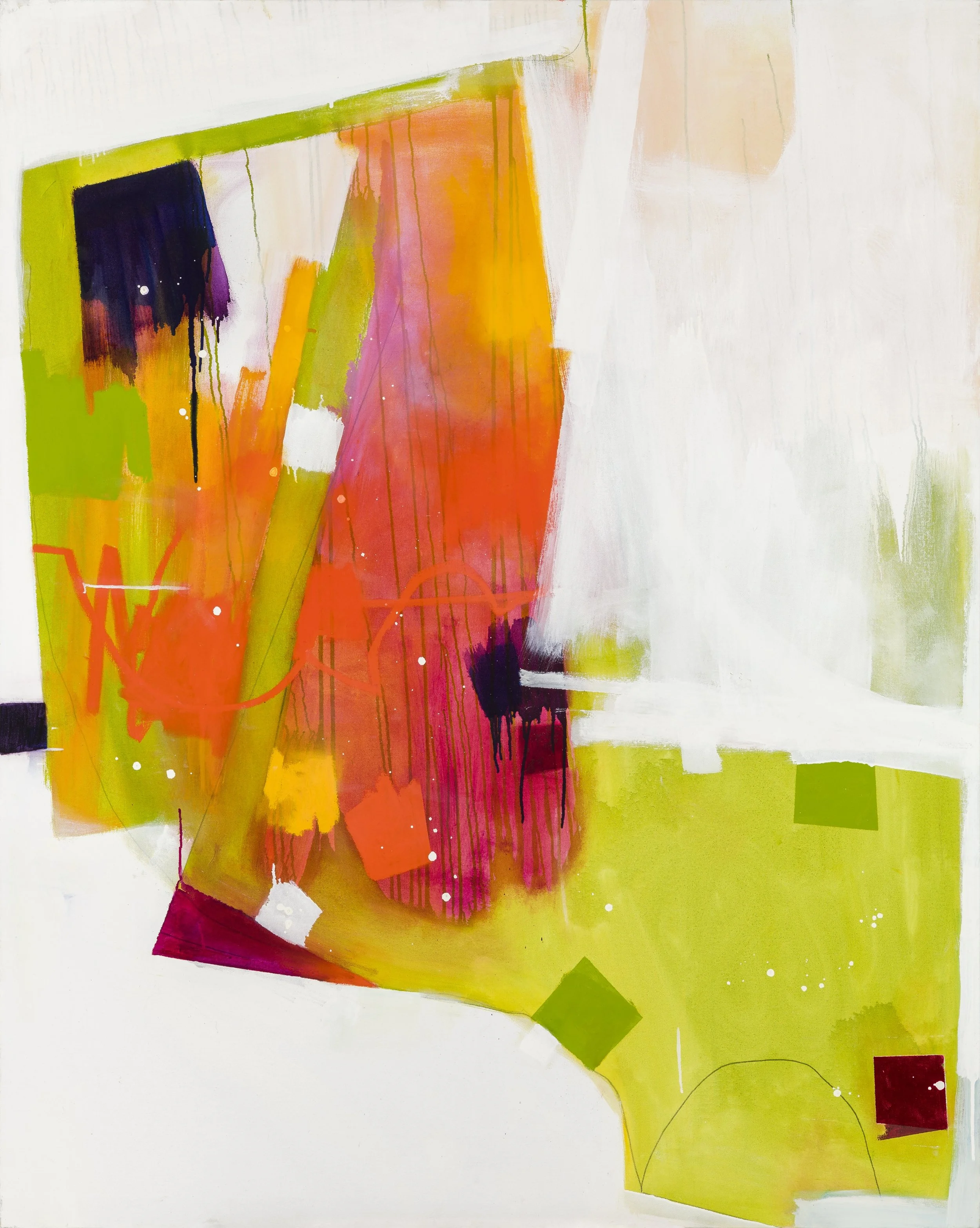 Moving into abstraction was a subtractive process. From my roots in the classical figurative tradition, I became interested in how much visual information is necessary to convey my ideas. I began to use white paint to mask out areas of my figure drawings that I considered secondary. White has now become a central component of my paintings, in tandem with the vibrant colors that occupy the same surface. Sometimes white serves as a background, sometimes it overlays color as a free-floating element, or jostles with those elements for primacy, reading as both a negative space and an active element. I liken this to the way the absence of a thing or a person can be as palpable as their presence.