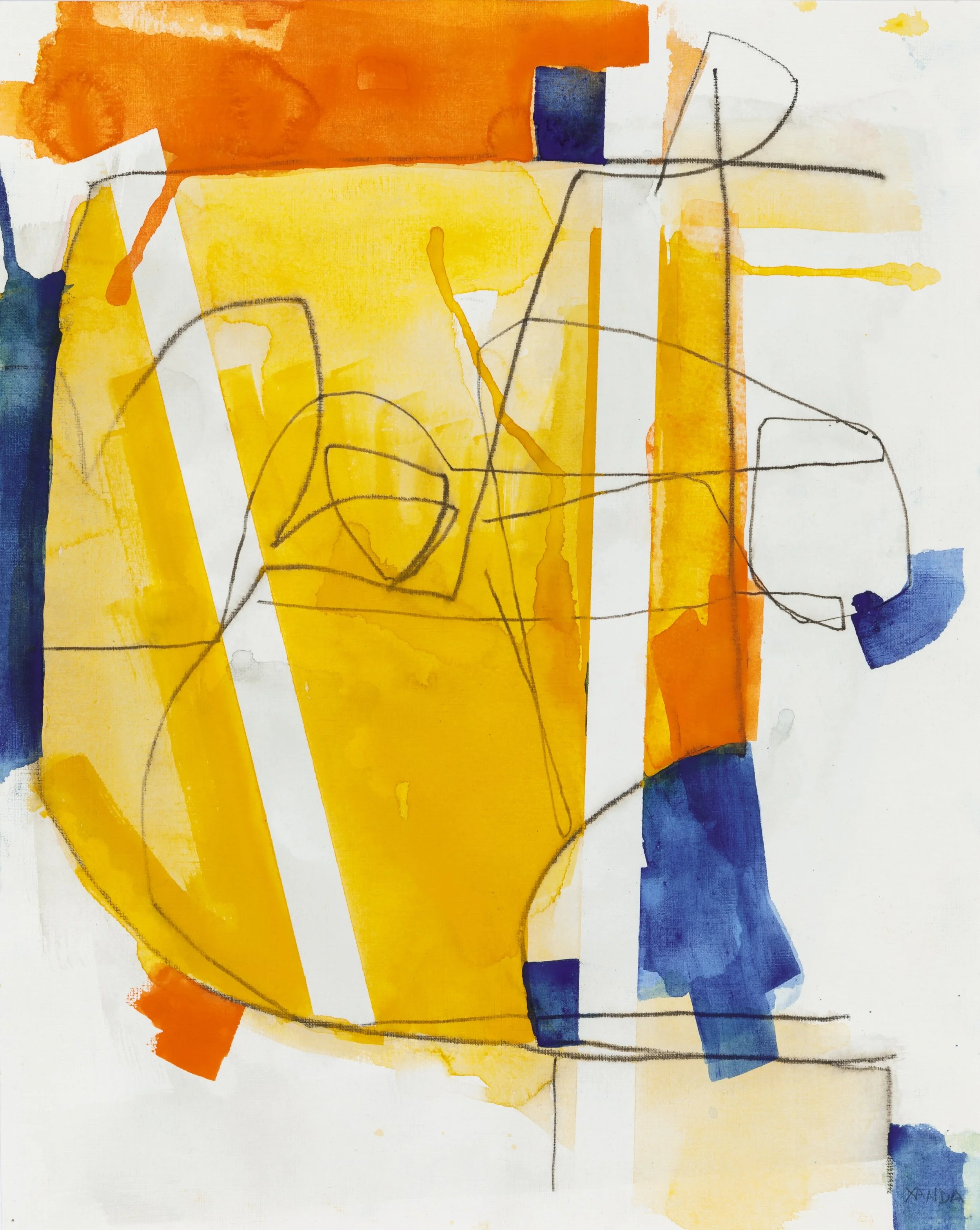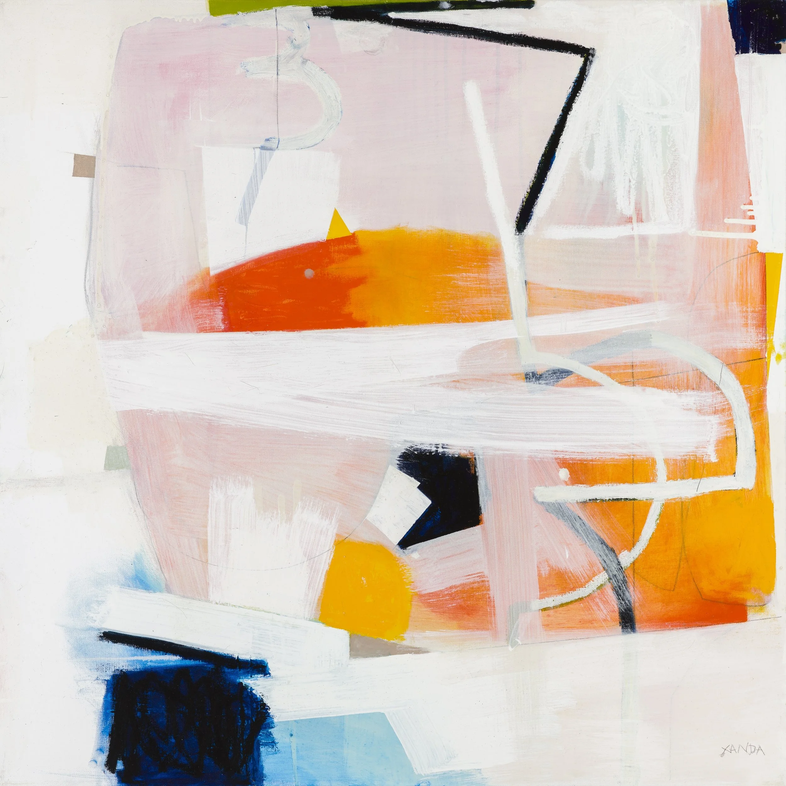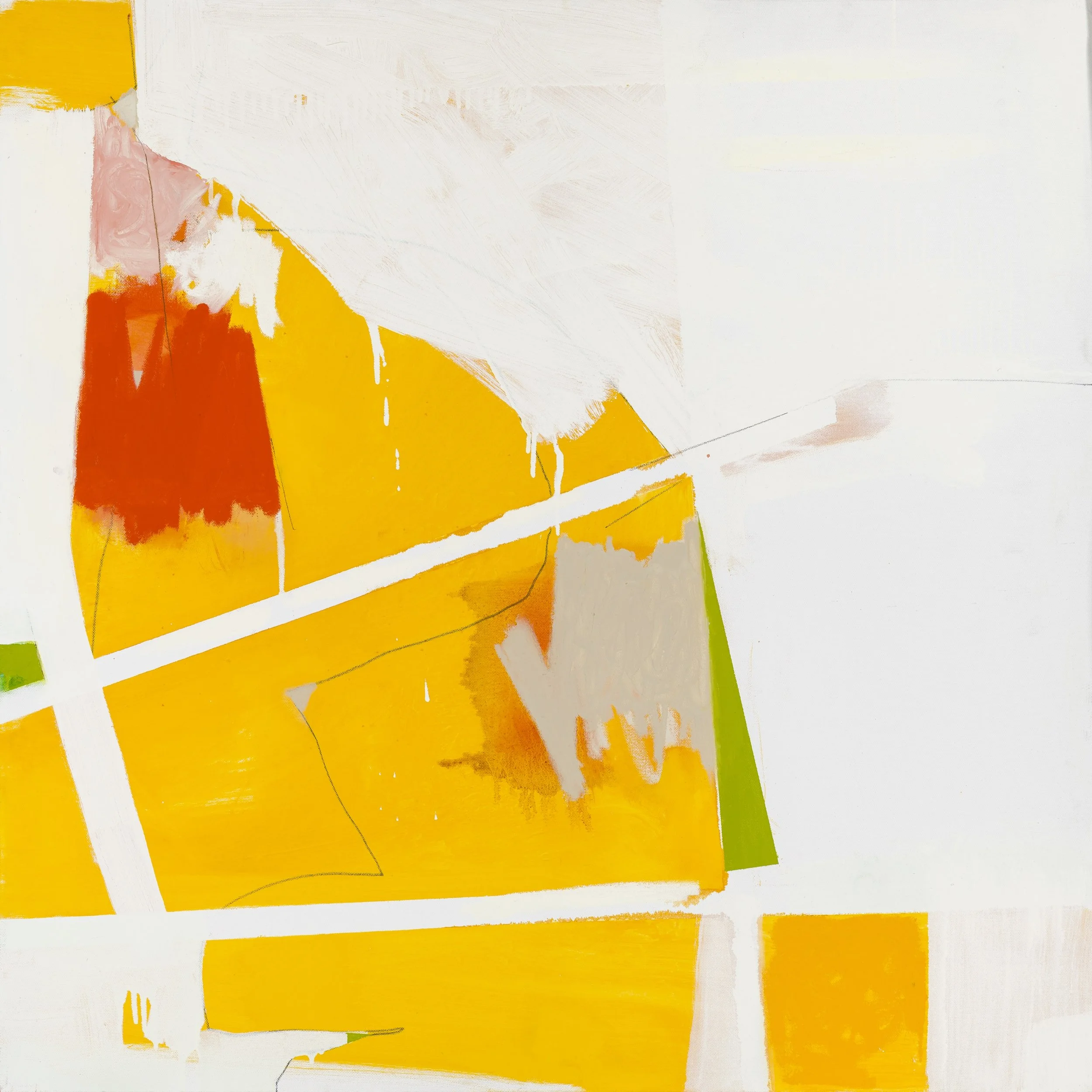 Moving into abstraction was a subtractive process. From my roots in the classical figurative tradition, I became interested in how much visual information is necessary to convey my ideas. I began to use white paint to mask out areas of my figure drawings that I considered secondary. White has now become a central component of my paintings, in tandem with the vibrant colors that occupy the same surface. Sometimes white serves as a background, sometimes it overlays color as a free-floating element, or jostles with those elements for primacy, reading as both a negative space and an active element. I liken this to the way the absence of a thing or a person can be as palpable as their presence.