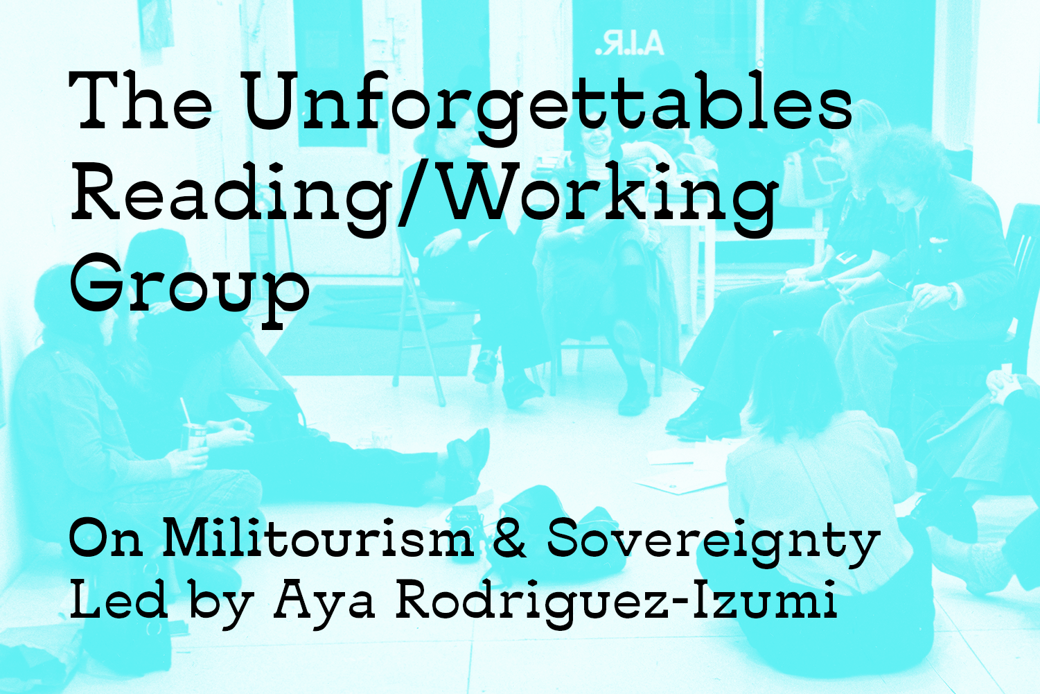 Join us on Thursday, March 13 at 6:30 PM for a session of The Unforgettables Reading/Working Group! Organized by artist Aya Rodriguez-Izumi around the theme of "Militourism & Sovereignty," this meeting will engage material by Teresia Teaiwa, Haunani-Kay Trask , and Dr. Jamaica Heolimeleikalani Osorio..
