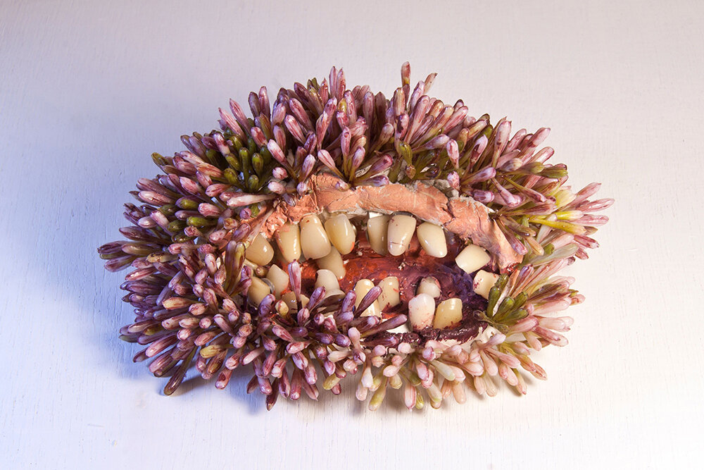 Jo Ann Block, Hair Stomach, 2015, teeth, artificial flower, clay, paint, 6 x 4 x 2 1/2 inches.