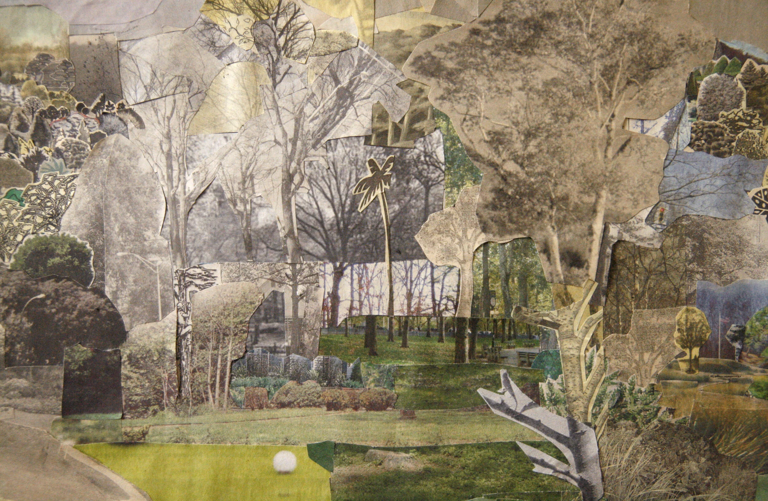 In her first solo exhibition in New York, Percoco aggregates found representations of nature to create composite landscapes and faux natural formations. She also presents plans for a related public project. In Field Studies, a central fabric sculpture mimics a heap of autumn leaves. The leaves have been gathered from printed fabrics of diverse textures, colors, and graphic styles, celebrating the use of nature as a decorative motif. This over-sized beanbag chair functions both as a nest in which one can immerse oneself in fake foliage and as seating for gallery visitors.In addition, Percoco cut hundreds of images of trees from New York area phone books ads and assembled them into landscape collages. These forested vistas can be seen as subliminal natural landscapes of New York. Percoco uses a shifting perspective to describe the changing viewpoint we experience while moving through a landscape.