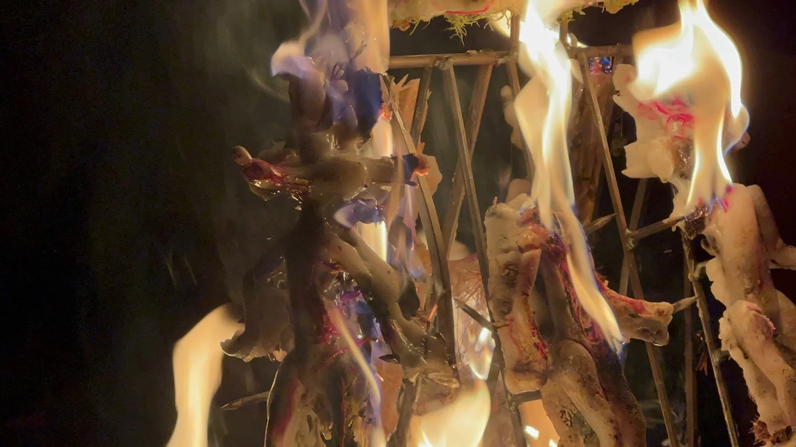 Anoushé Shojae-Chaghorvand, Dedication of manic energy, 2022, wax, fuse, lichen, pine needles, hemlock, dirt, charcoal, and steel.