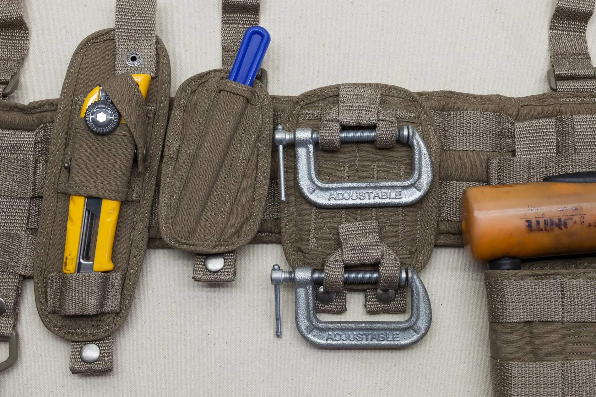 Mimi Biyao Bai, Harness, 2024, Nylon webbing, rip-stop cotton, thread, elastic, plastic hardware, metal snaps, rubber mallet, ruler, net needle, c-clamps, flashlight, u-lock, seam ripper, utility knife, calligraphy pen, and thread snips, dimensions variable.
