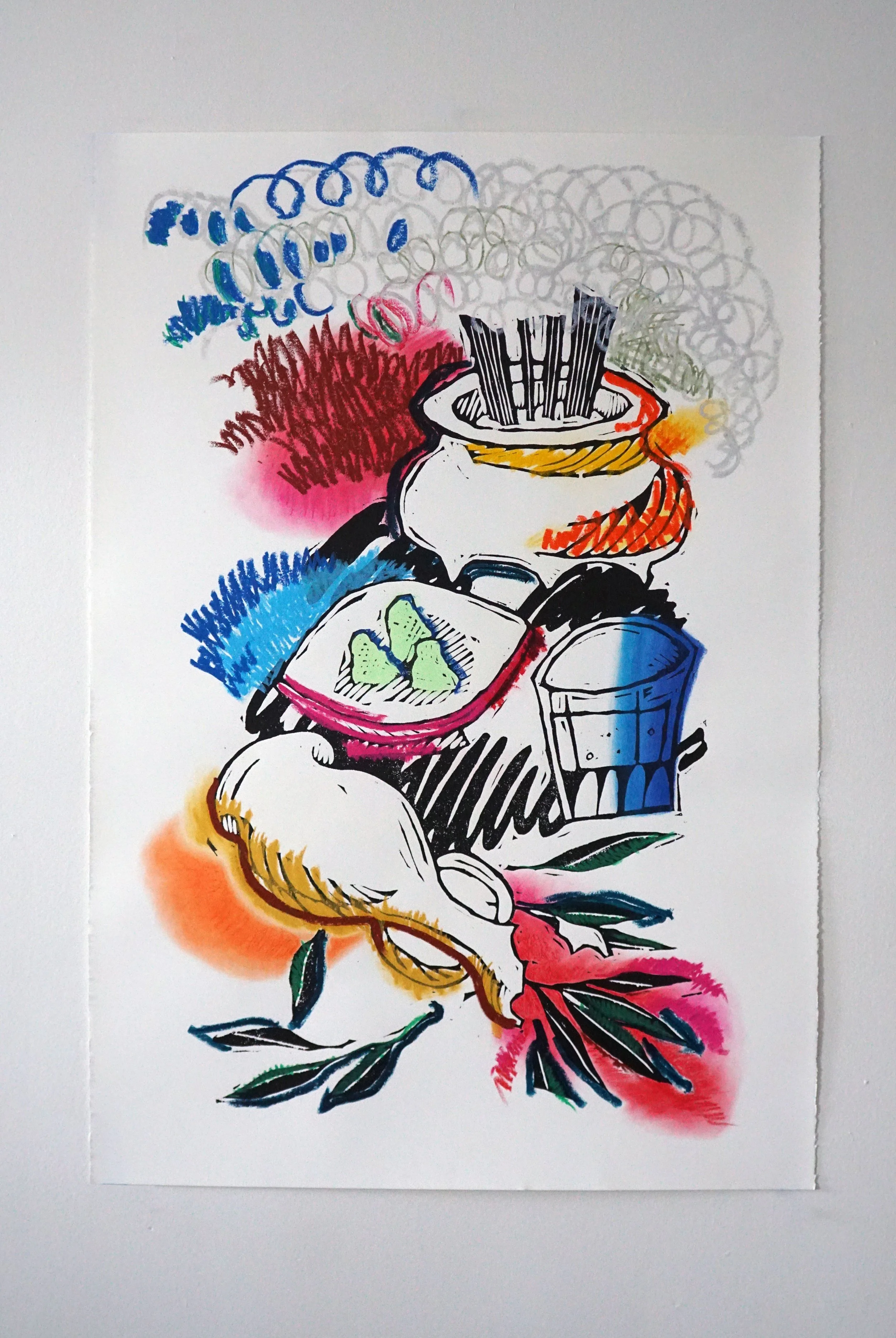 Traces of the Last Battle builds upon the work Rodriguez-Izumi created in dialogue with the book Okinawa’s Tragedy: Sketches from the Last Battle of WWII for her 2018 Fellowship exhibition, TC-1. The Battle of Okinawa, which ended in 1945, was the largest naval assault in the Pacific Theater of World War II, and claimed the lives of an estimated 100–150,000 of the then 300–500,000 local and civilian population. Written by William T. Randall, the publication of Okinawa’s Tragedy in 1987 marked the first time that first-hand Okinawan experiences of the battle were translated into English. The book, which was intended initially to serve as a learning tool for Okinawan college students, was illustrated by woodblock prints created by Rodriguez-Izumi’s father, José Rodríguez. In this exhibition, Rodriguez-Izumi transforms blown up reproductions of her father’s prints with colorful, energetic interventions in pastel, creating a collaboration between generations, histories, and time.
